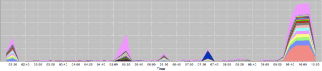 One of our hosting partners, Peer1, provided us these InMon graphs to help illustrate the timeline. What we saw was not one single attack, but 6 separate attacks beginning at 2:10AM PST on March 3rd. All of these attacks were directed at a single site hosted on WordPress.com’s servers. The first graph shows the size of the attack in bits per second (bandwidth), and the second graph shows packets per second. The different colors represent source IP ranges.